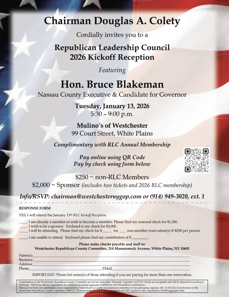 You’re invited to join us for the Westchester Republican Leadership Council 2026 Kickoff Reception on January 13 in White Plains. This will be...